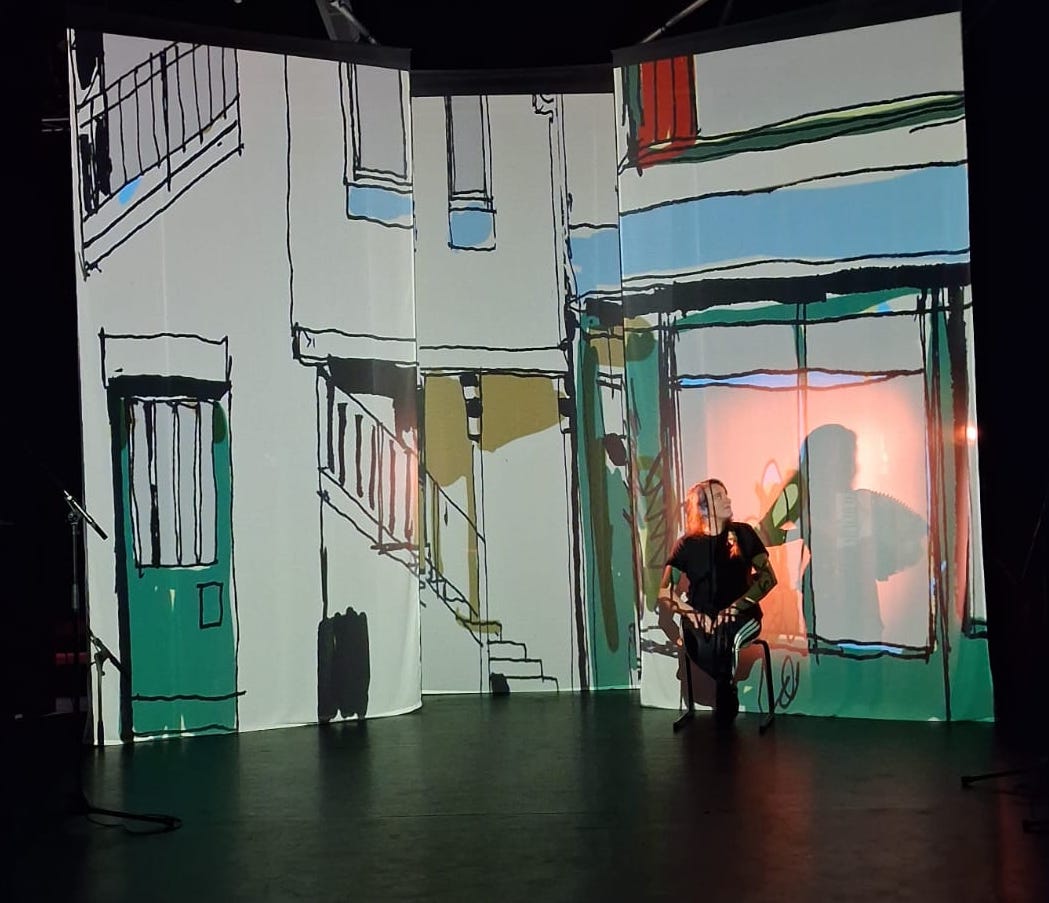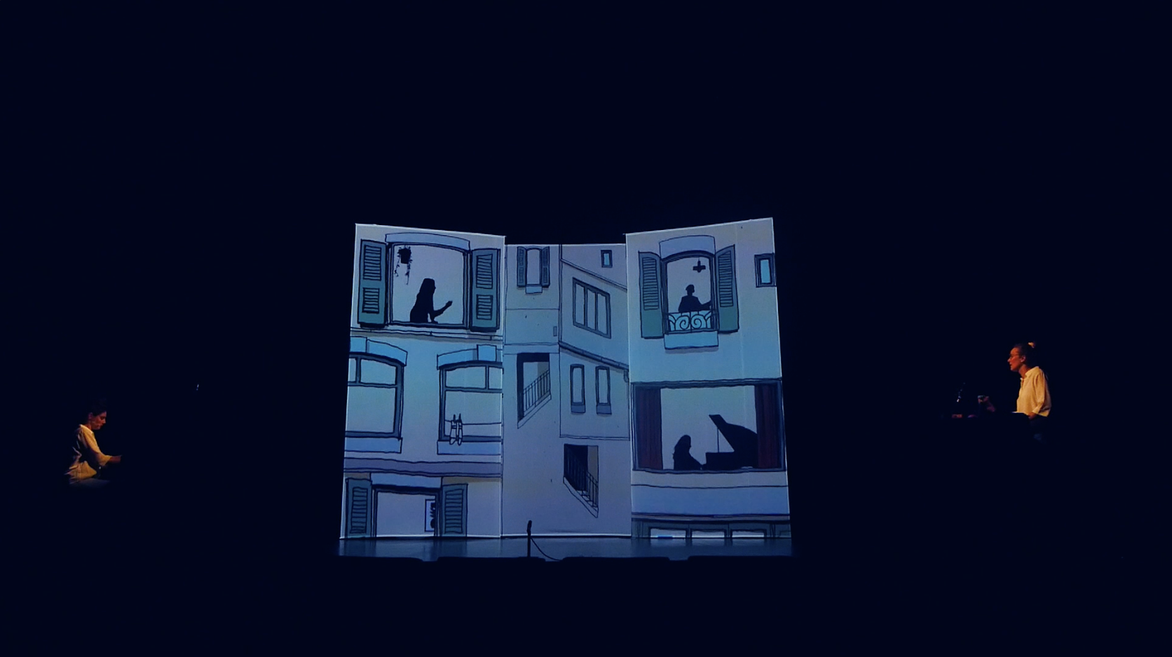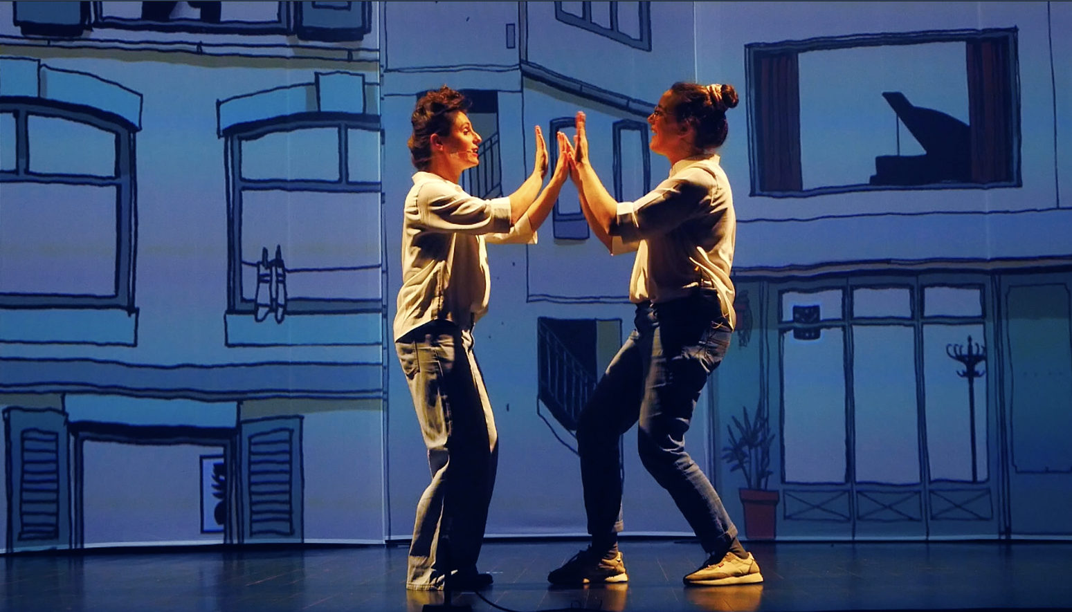À la manière d’une bande dessinée animée, l’immeuble devient la miniature d’une société des langages, incarnée par deux interprètes, musiciennes, chanteuses et comédiennes.